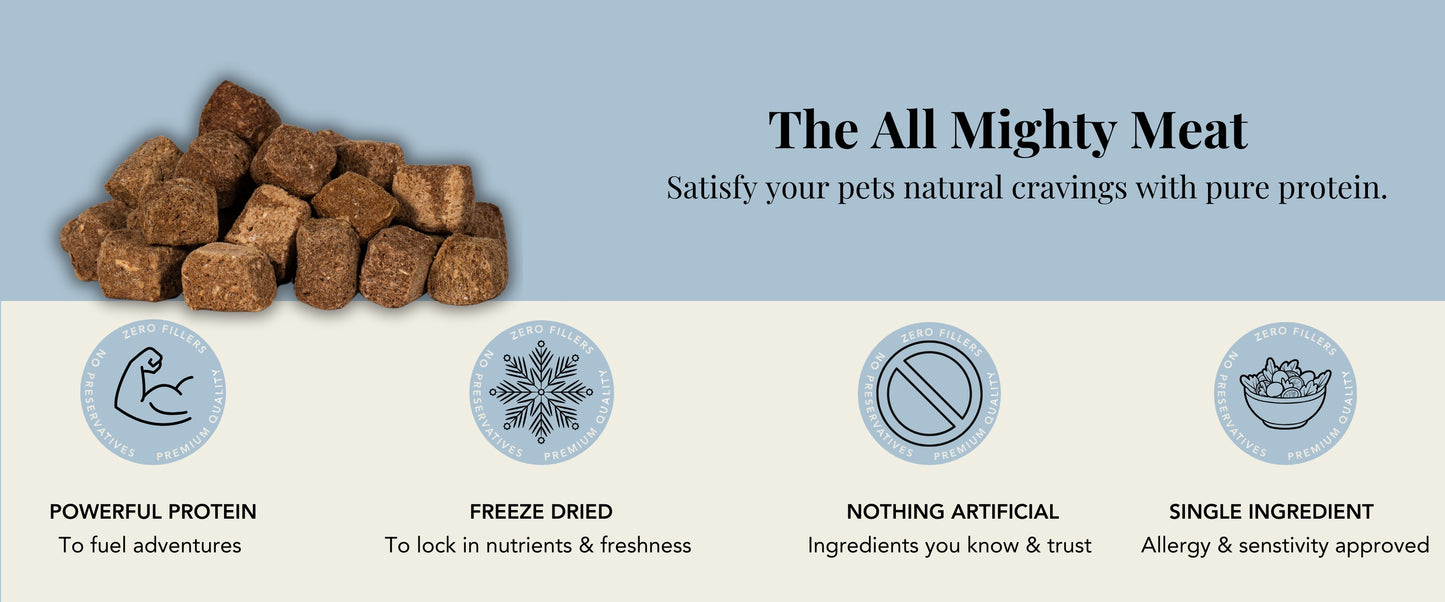Made by taking a single pure protein ingredient and locking in its raw nutritional benefits we know your dog or cat will never leave you alone once they try these delectable morsels. Great for allergy and sensitive stomachs, treating and training, adding to any meal, or even just shaking the bag to have them scrambling for more.