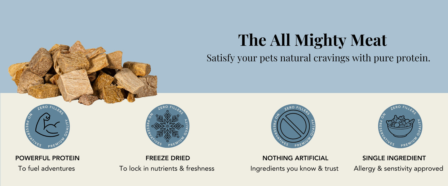 Made by taking a single pure protein ingredient and locking in its raw nutritional benefits we know your dog or car will never leave you alone once they try these delectable morsels. Great for allergy and sensitive stomachs, treating and training, adding to any meal, or even just shaking the bag to have them scrambling for more.